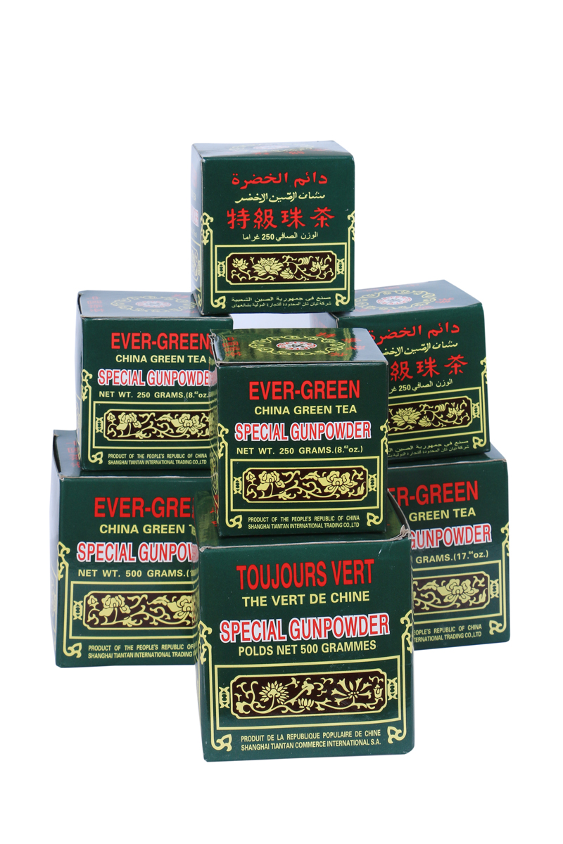 The best Gunpowder Green Tea is Evergreen Brand. It’s not only famous in China but also all over the world.Gunpowder Green Tea derives its name from the shape of its finished tea. The very dark green tea leaves have been rolled into little pellets which look like gunpowder to some connoisseurs.Meanwhile people call it Gunpowder Because: The tea is so well curled and tightened which looks like a small ball or pearl; when you put the tea into your hands, you feel it is heavy; when you pour boiling water into the tea, you can see all large tea leaves spreading out immediately just like explosion. Good Gunpowder Tea uses older tea leaves unlike other varieties of green tea. Tea steeped from Gunpowder has a dark golden color, roasted or toasted taste with a strong aftertaste lingering in the front palette, and a strong roasted or toasted aroma. You can also judge the quality of Gunpowder Green by its appearance. The well tightened and curled tea looks like tiny pearl with dark-green shining color.